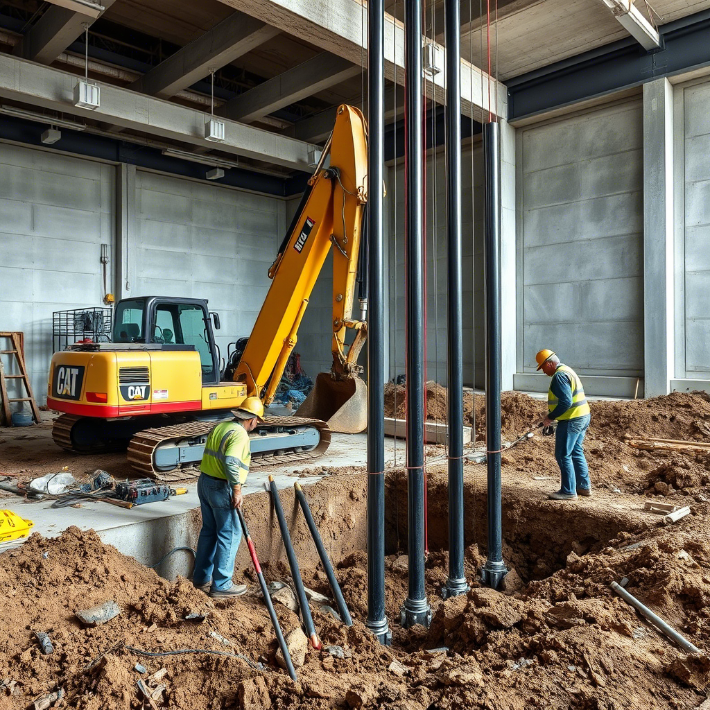 В зависимости от выбранного типа свай производится их монтаж (бурение, ввинчивание или забивание). После установки сваи соединяются с существующим фундаментом через железобетонный ростверк или другие конструктивные элементы.Контроль качества