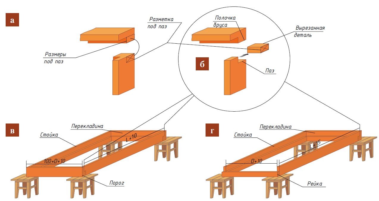 На концах стоек размечают вырез под паз (рис. а), точно снимая размеры выступающей части (полочки) перекладины и порога. По разметке выпиливают углубление (рис. б), затем соединяют детали и фиксируют шурупами (рис. в). Если порог не предусмотрен, нижние концы стоек временно скрепляют рейкой с соблюдением ширины полотна и боковых зазоров (рис. г).