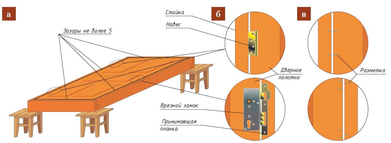 Дверное полотно размещают внутри коробки и выравнивают зазоры по краям (рис. а). Прикладывают навесы и замковую фурнитуру по месту установки (рис. б), намечая их расположение (рис. в).