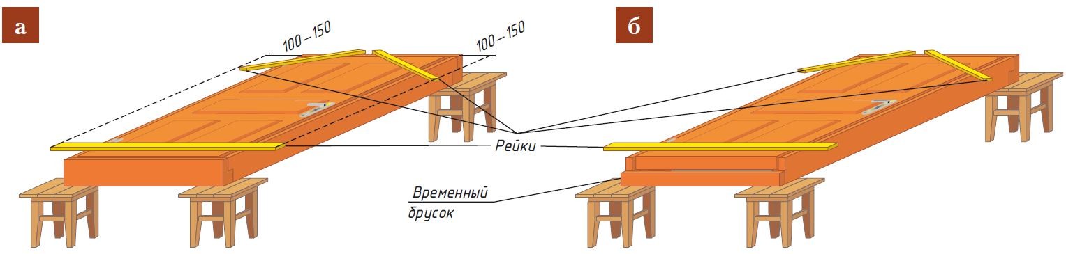 - Дверное полотно ставят на ребро (рис. а).