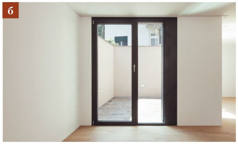 Двери из ПВХ (рис. в) отличаются прочностью, простотой ухода и долговечностью. Плотные примыкания обеспечивают высокую шумоизоляцию, но одновременно снижают естественную вентиляцию — это стоит учитывать при проектировании воздухообмена.