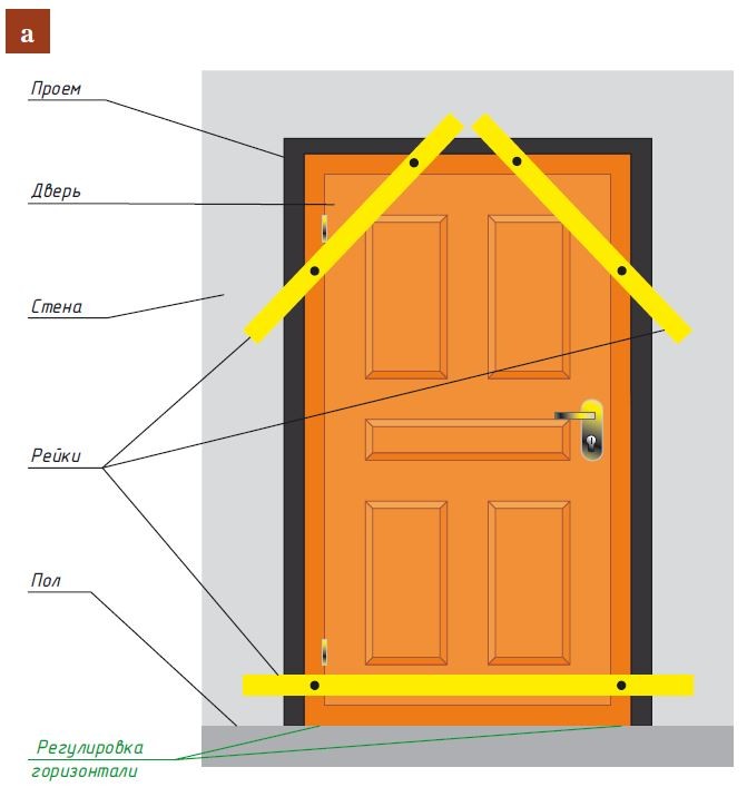 - Вертикальный перекос компенсируют шабашками между концами реек и стеной: под верхние рейки — чтобы наклонить дверь вперёд, под нижние — назад (рис. б).