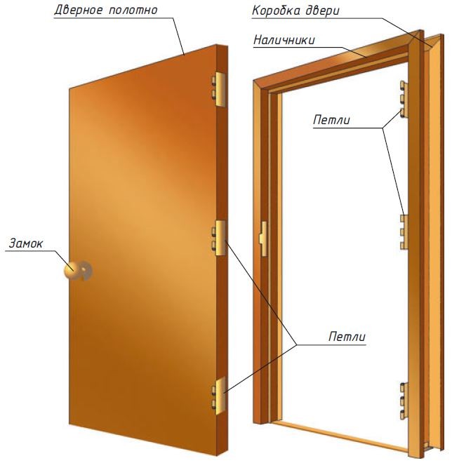 Ключевые характеристики двери — шумопоглощение, теплозащита и механическая прочность — обеспечиваются совокупностью конструктивных элементов: коробкой, дверным полотном, фурнитурой (петли, ручка, замок), порожком и наличниками.