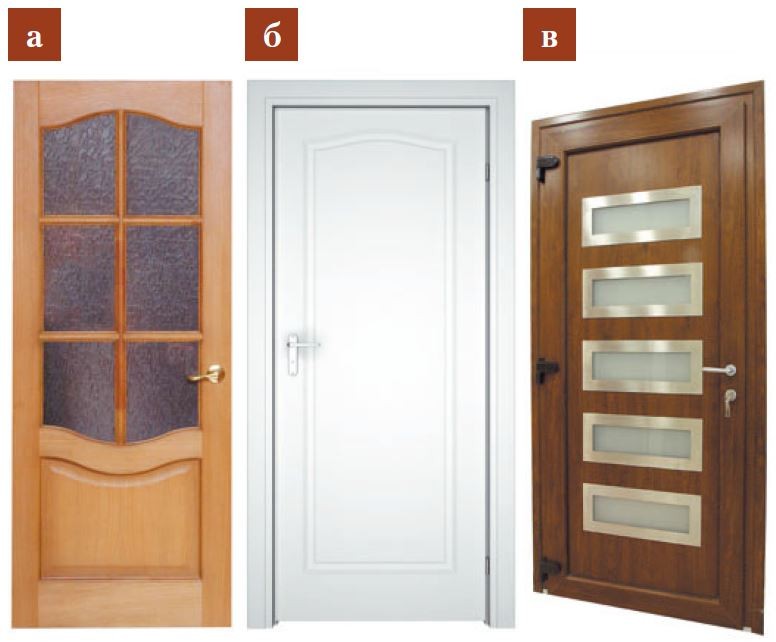 Деревянные двери (рис. а) изготавливают из массива или клеёного щита. Они обеспечивают хорошую шумоизоляцию и создают уютную атмосферу благодаря натуральной текстуре.