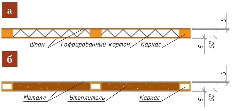 Каркасные конструкции состоят из деревянного или металлического каркаса (рис. а, б), обшитого фанерой или оргалитом с облицовкой ламинатом или шпоном. Внутренние полости заполняют гофрированным картоном или утеплителем. Каркасные двери на деревянной основе — одни из самых бюджетных.
