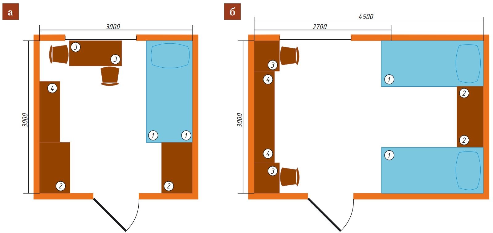 Обозначения: 1 — двухъярусная кровать; 2 — двухстворчатый шкаф с антресолями; 3 — объединённые рабочие места; 4 — стеллаж для книг и игрушек.