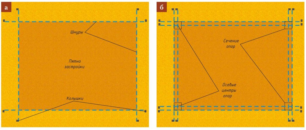 - б — протягивание шнуров осевых линий (отступ от границ = половина ширины опоры);