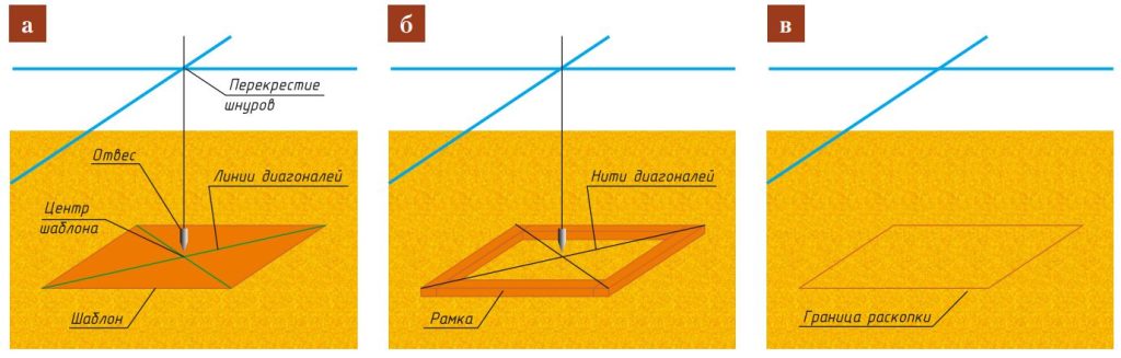 - г — определение границ раскопок ям с помощью шаблона.