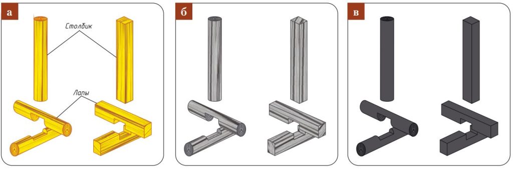 - а — нарезка столбиков (бревно ∅ ≥ 15 см или брус ≥ 10×10 см) и лап (длина ≥ 80 см);