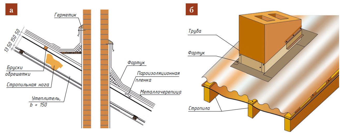 В местах прохода дымовых и вентиляционных труб устраивают водоотвод в виде треугольной разделки с коньком, параллельным направлению стока воды. Дымовые трубы оснащают утолщением в четверть кирпича на высоте 100–300 мм от плоскости крыши. Над вентиляционными стояками устанавливают двускатные металлические зонты.