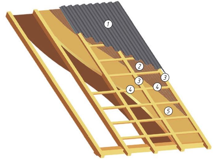Обозначения: 1 — кровельное покрытие; 2 — подкровельная плёнка; 3 — стропила; 4 — обрешётка; 5 — утеплитель.