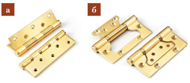 Для лёгких межкомнатных дверей удобны петли-бабочки (рис. б) — их толщина около 3 мм, они не требуют врезки и легко монтируются.