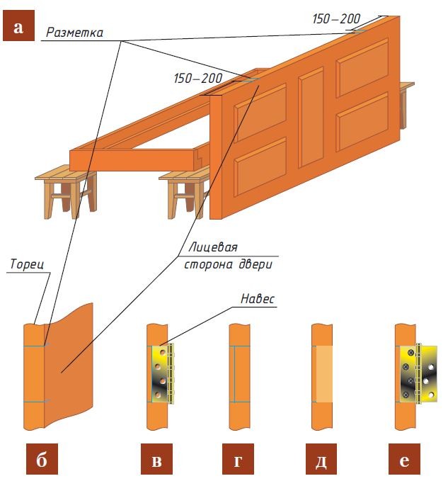 - Дверное полотно ставят на ребро (рис. а).