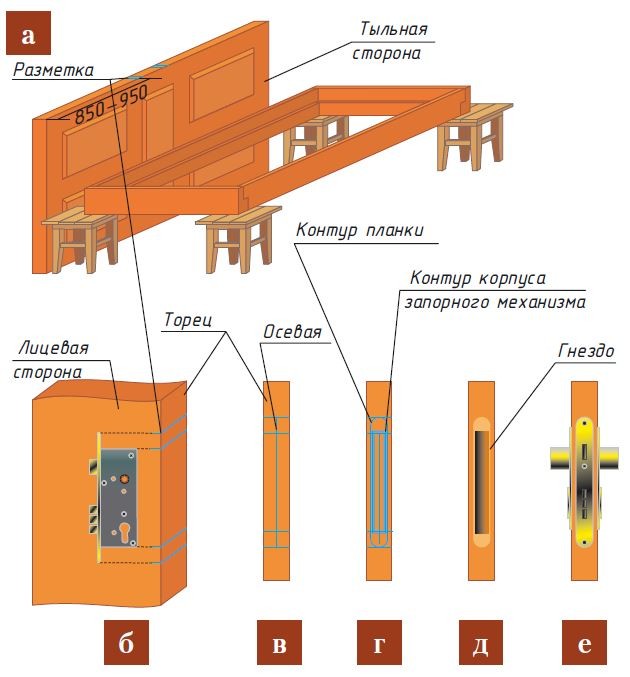 - Готовят гнездо под механизм и углубление под фиксирующую планку (рис. д).