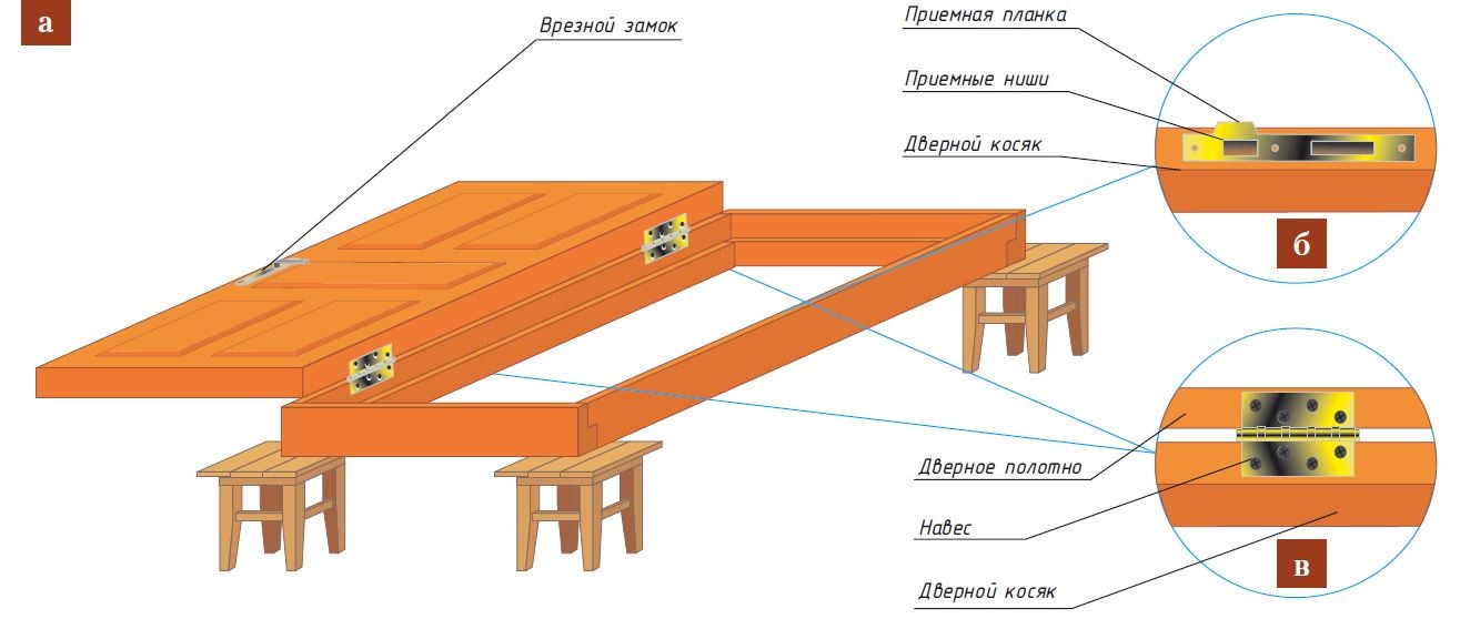 На коробке размечают и заглубляют ниши под защёлку и запорный язычок, закрепляют приёмную планку. Затем полотно раскладывают в распахнутом положении относительно коробки (рис. а) и окончательно фиксируют навесы к стойке по ранее намеченным отметкам (рис. б).
