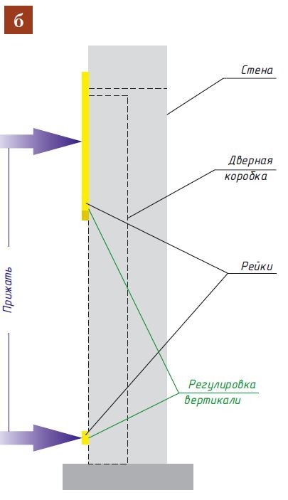 - Вертикальный перекос компенсируют шабашками между концами реек и стеной: под верхние рейки — чтобы наклонить дверь вперёд, под нижние — назад (рис. б).