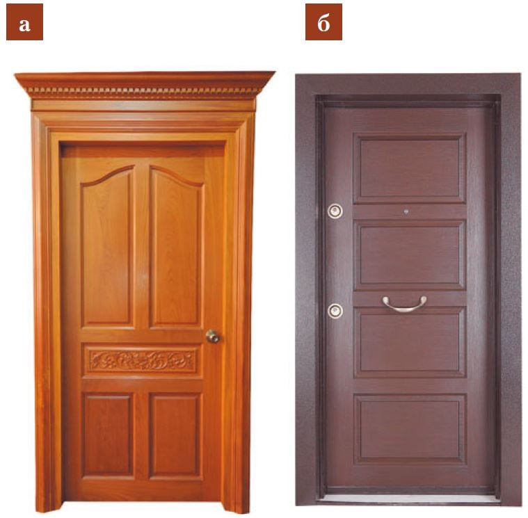 Деревянные двери (рис. а) изготавливают из массива или клеёного щита. Они обеспечивают хорошую шумоизоляцию и создают уютную атмосферу благодаря натуральной текстуре.