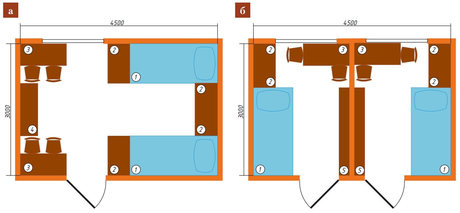 Обозначения: 1 — двухъярусная кровать; 2 — платяной шкаф; 3 — совмещённые рабочие места; 4 — стеллаж; 5 — навесные полки.
