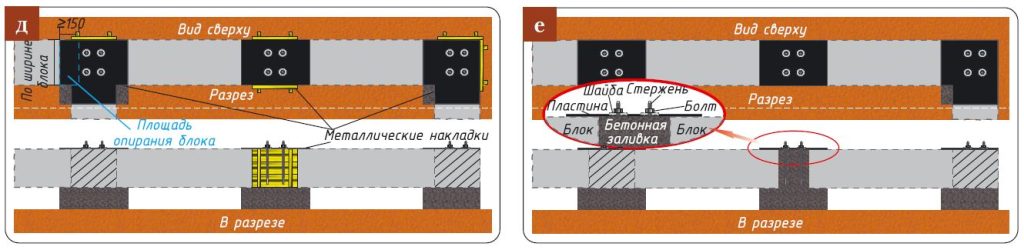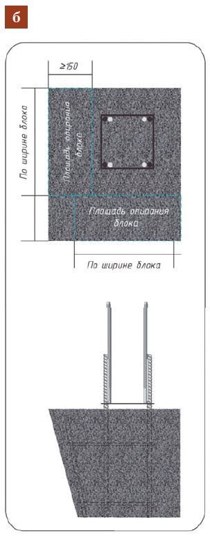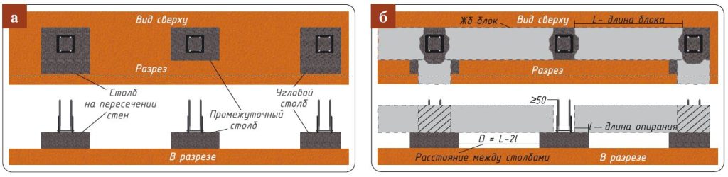 - Опорная часть — монолитные железобетонные столбы с расширенными оголовками под блоки.