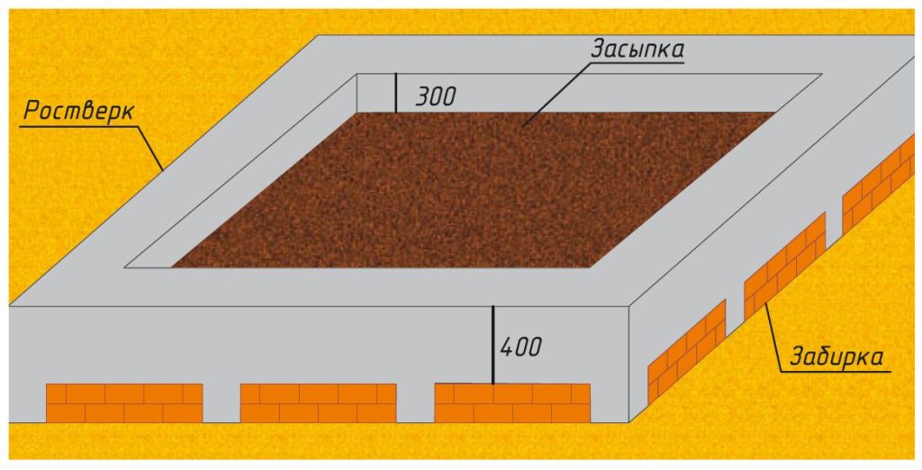 - Устройство забирки — заполнение пространства под ростверком кирпичной, каменной или бутовой кладкой.