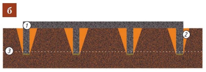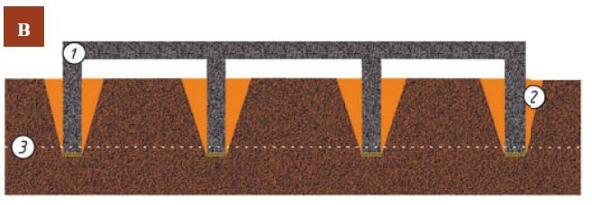 Конструкция объединяет лучшие качества столбчатого, свайного и ленточного фундаментов: