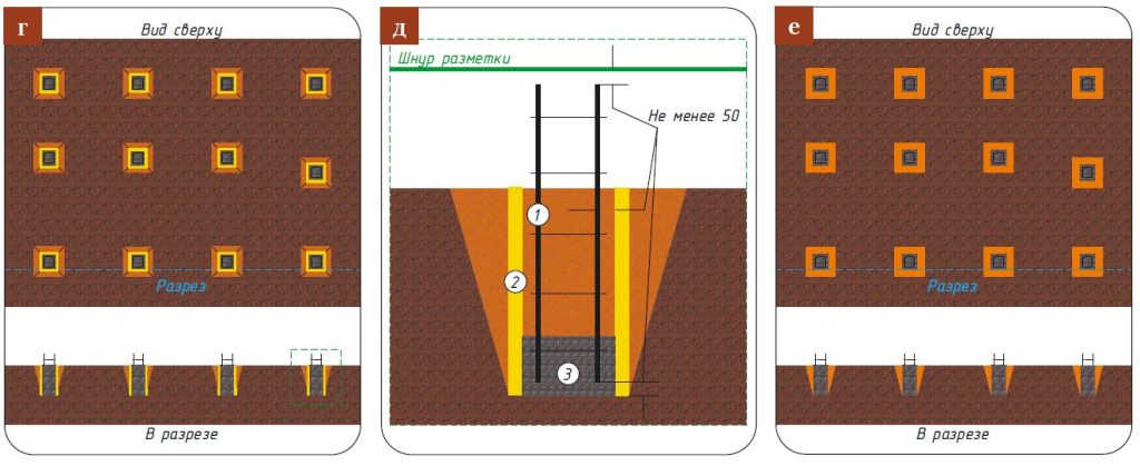 - д — коррекция положения арматурного каркаса (нижний конец не касается дна, верхний отстоит от шнура разметки на 5 см);