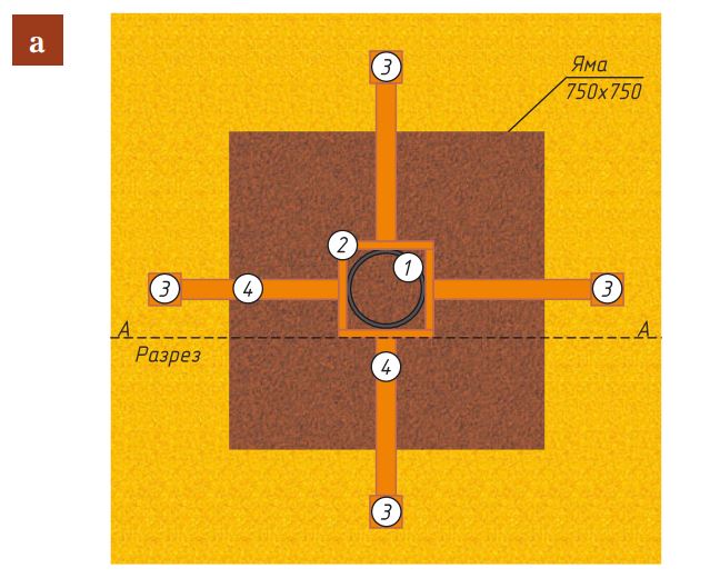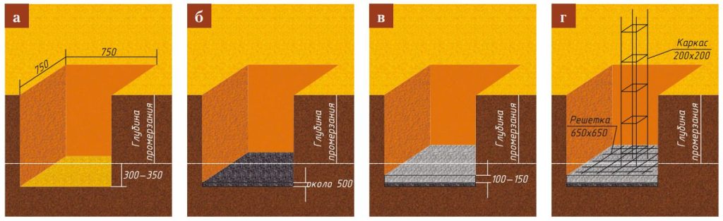 - а — копка квадратной ямы 75×75 см с учётом глубины промерзания;