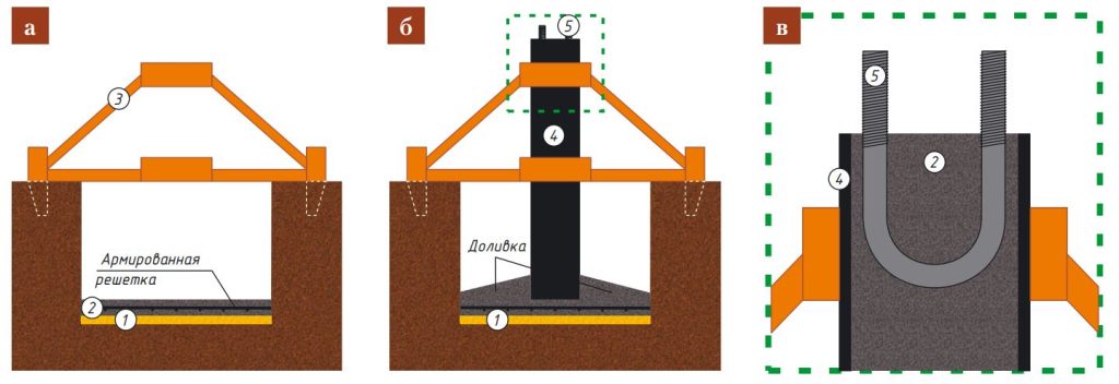 - в — заполнение трубы бетоном с уплотнением, установка анкера или пластины для крепления.