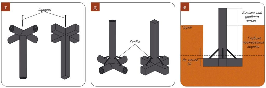 - г — сборка лап в перекрестие, фиксация шурупами к столбику;