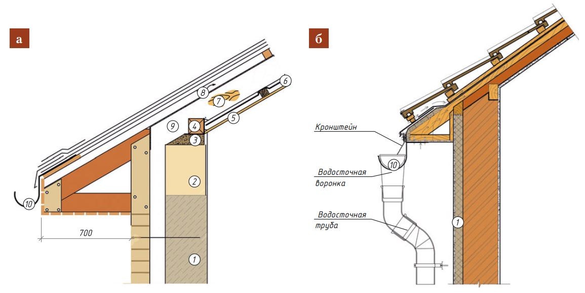 Обозначения: 1 — наружная стена; 2 — монолитный ростверк; 3 — подложка; 4 — мауэрлат; 5 — подшивка; 6 — пароизоляционная плёнка; 7 — стропильная нога; 8 — брусок обрешётки; 9 — утеплитель; 10 — водосточный жёлоб.